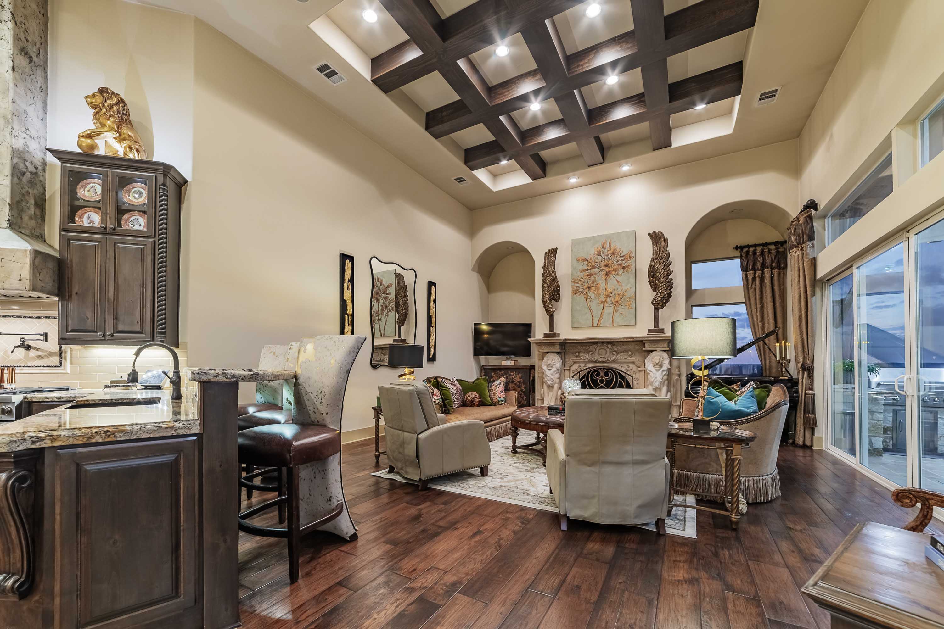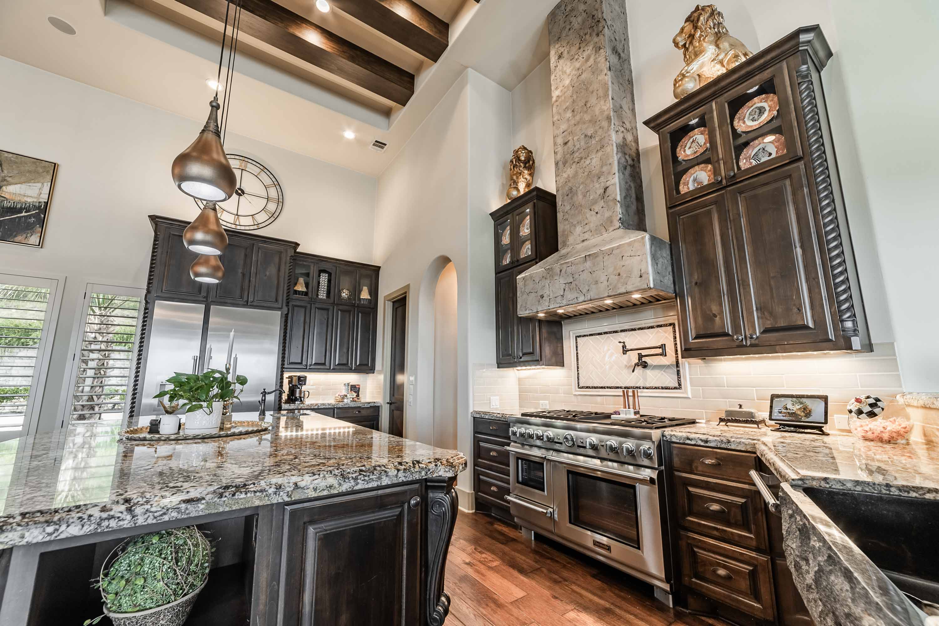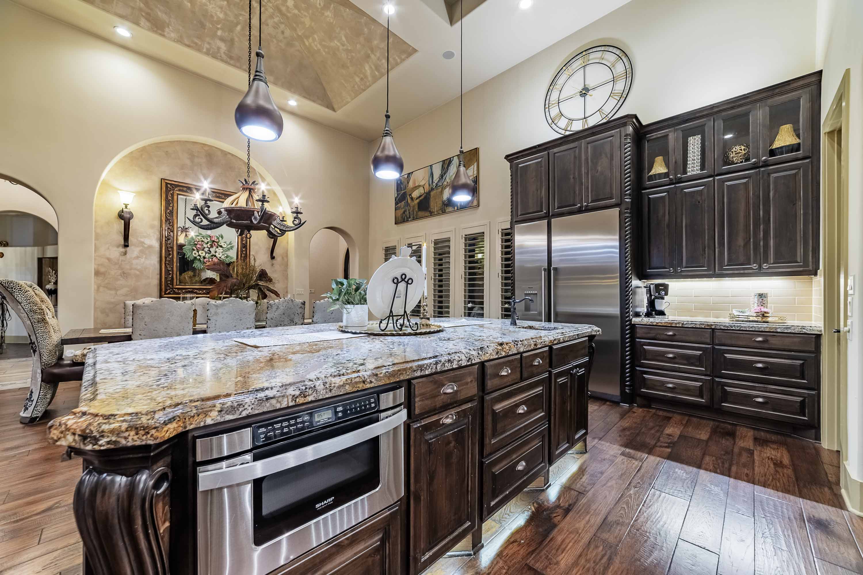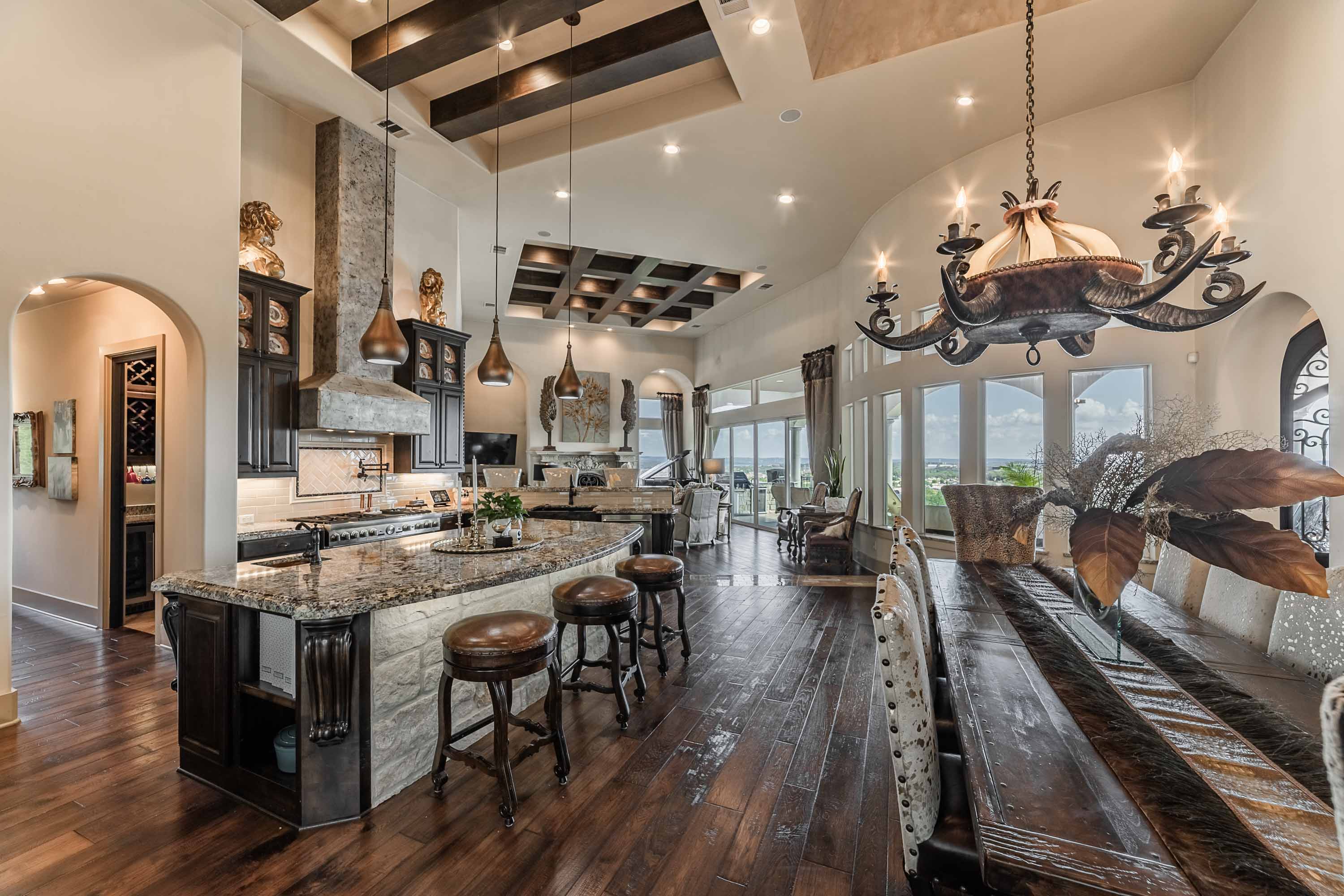 Designed to live like a single story, all four bedrooms offer en-suite baths and walk-in closets, with an upstairs wing providing two additional bedrooms, a living area, and its own HVAC zone. The open kitchen, dining, and family areas center around a massive double-ogee granite island, with chef’s amenities including double dishwashers, pot filler, six-burner cooktop with griddle, convection/steam ovens, warming drawer, built-in refrigerator, walk-in pantry, copper prep sink, and extensive cabinetry. A Cantera-door wine room with refrigerator and bar completes the space.