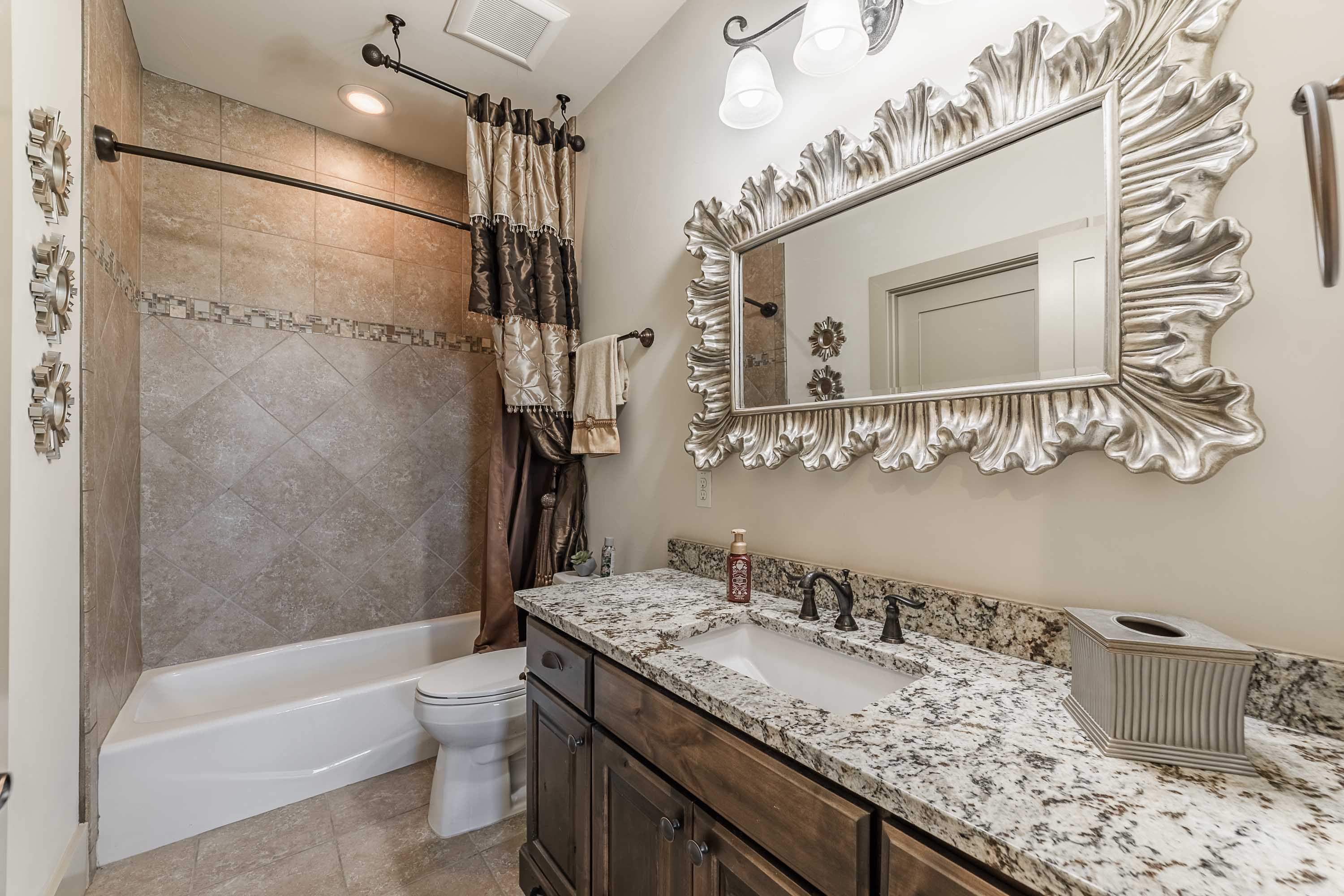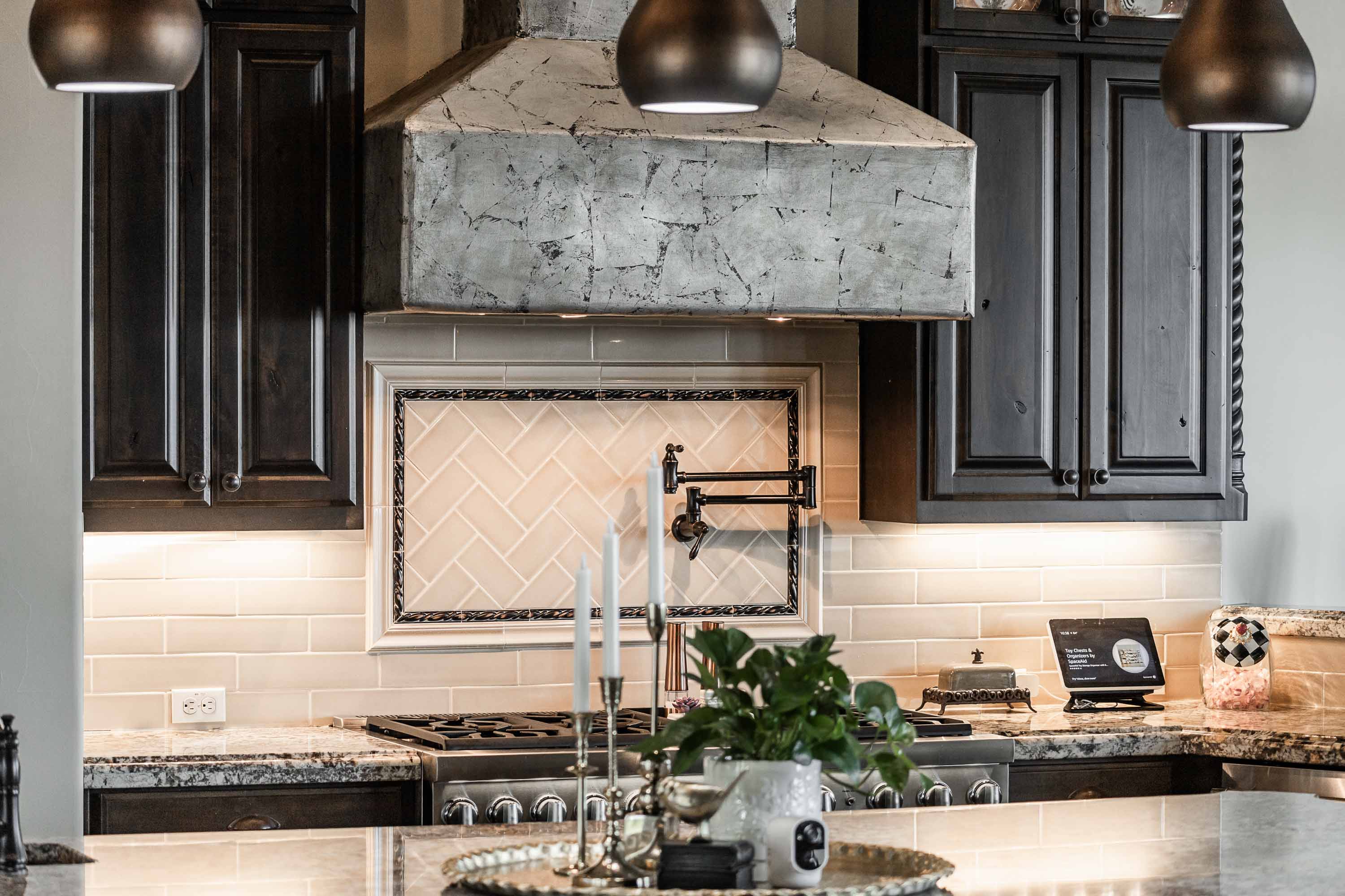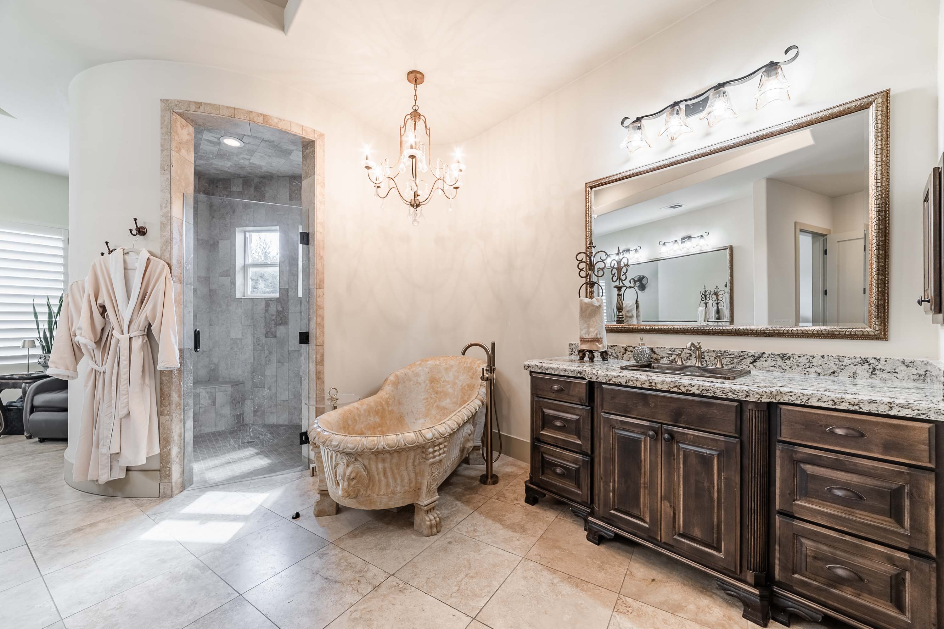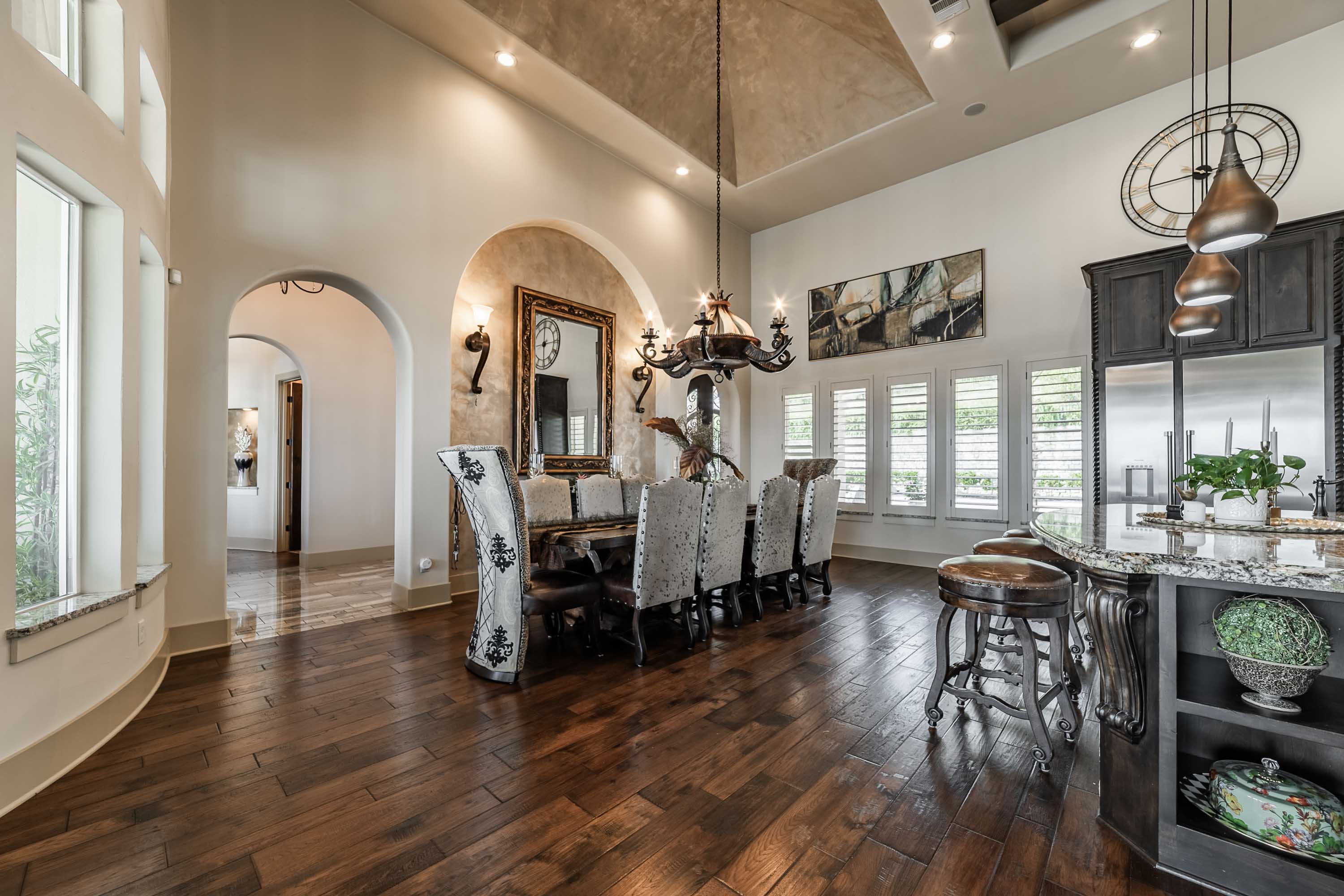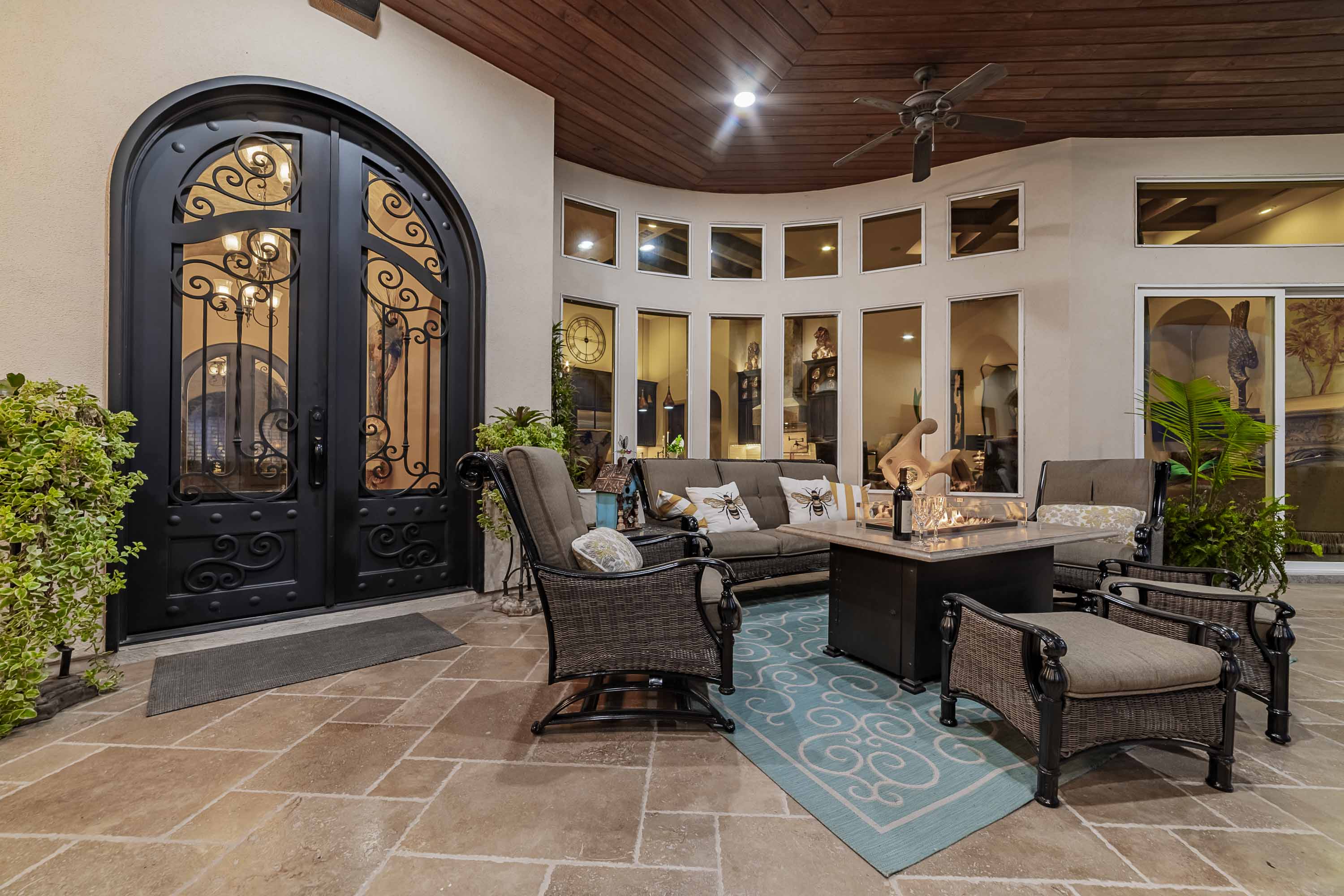 Designed to live like a single story, all four bedrooms offer en-suite baths and walk-in closets, with an upstairs wing providing two additional bedrooms, a living area, and its own HVAC zone. The open kitchen, dining, and family areas center around a massive double-ogee granite island, with chef’s amenities including double dishwashers, pot filler, six-burner cooktop with griddle, convection/steam ovens, warming drawer, built-in refrigerator, walk-in pantry, copper prep sink, and extensive cabinetry. A Cantera-door wine room with refrigerator and bar completes the space.