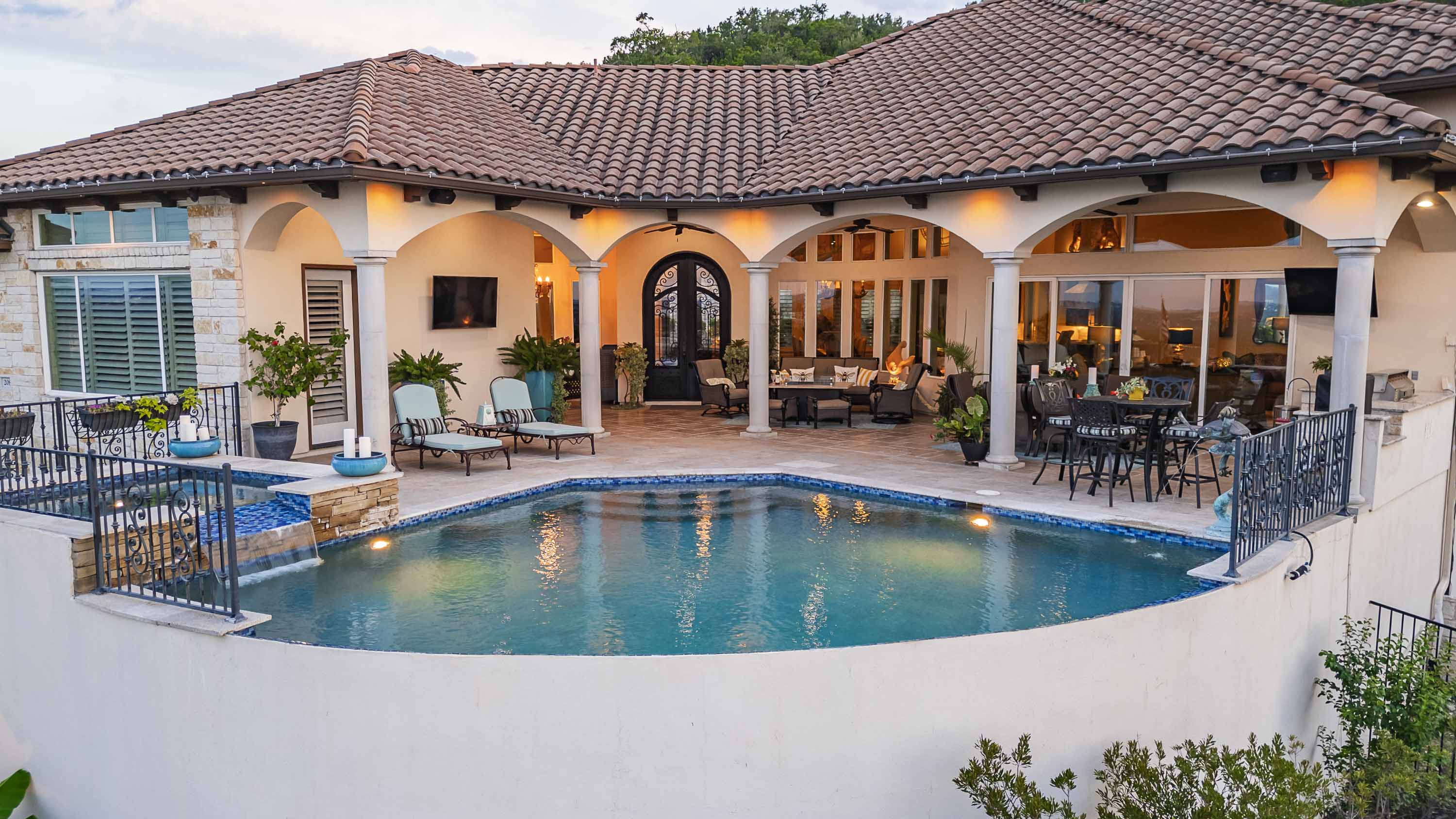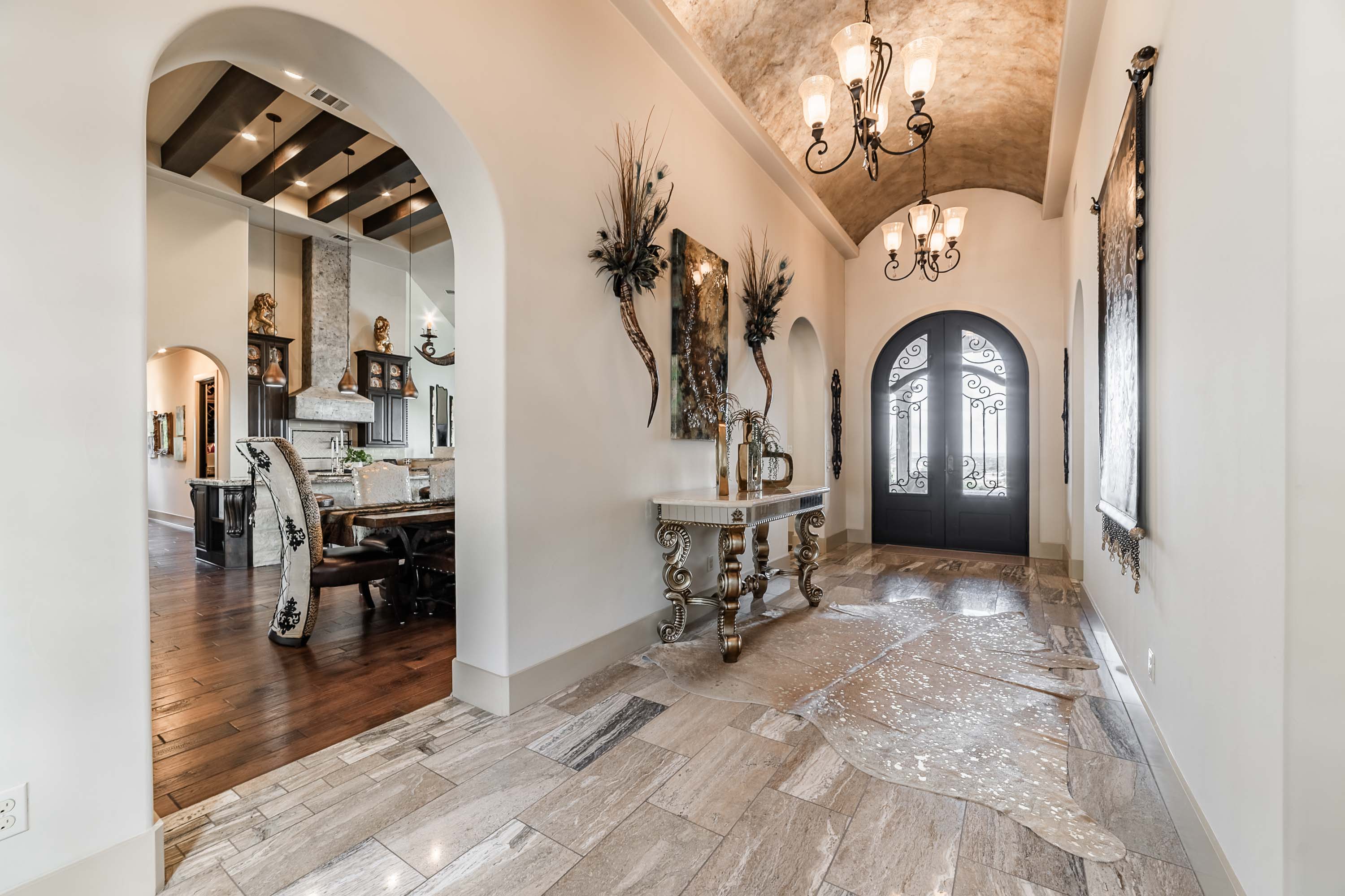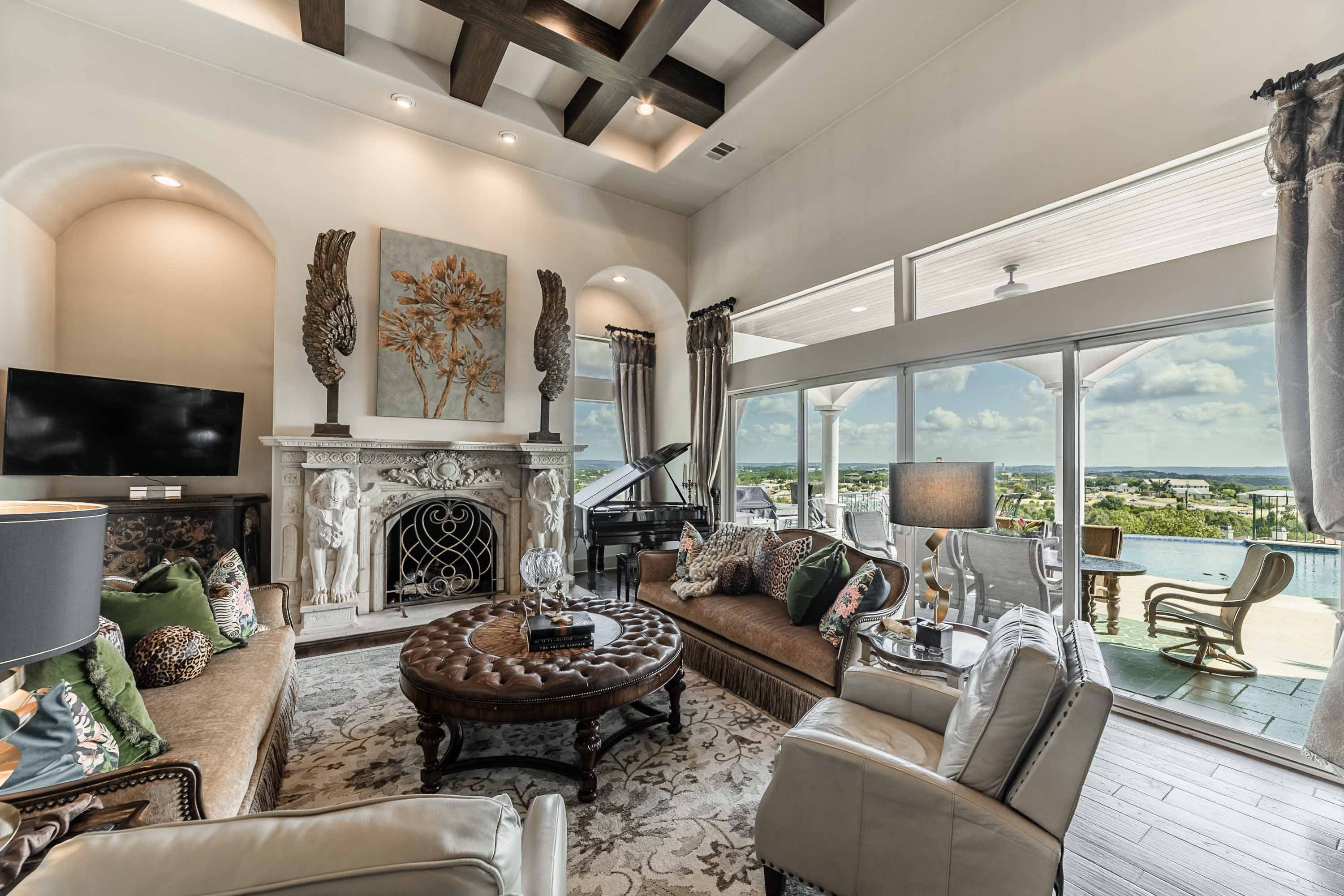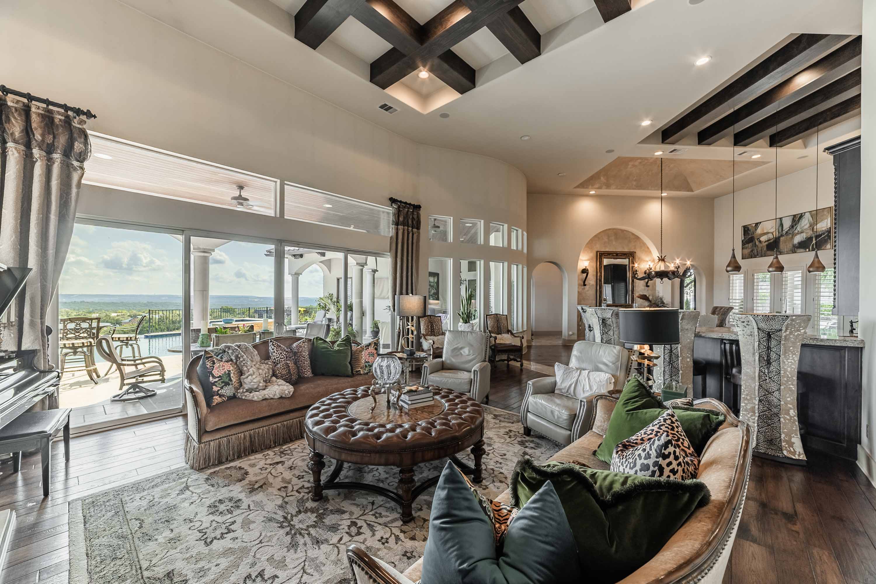 The crown jewel of Bella Montagna, where every arrival feels like a grand entrance. Perched on the premier hilltop with commanding presence and visibility, this estate makes a statement from the moment you arrive. A gated drive leads to an expansive motor court with parking for 15+ vehicles, setting the stage for grand-scale living and entertaining. Texas limestone, tile roof, and double Cantera iron doors open to a hand-painted barrel ceiling entry framing sweeping Lake Travis and Hill Country views. Inside, soaring ceilings and custom artistry abound—wood beams, floating and hand-painted ceilings, and layered details throughout.