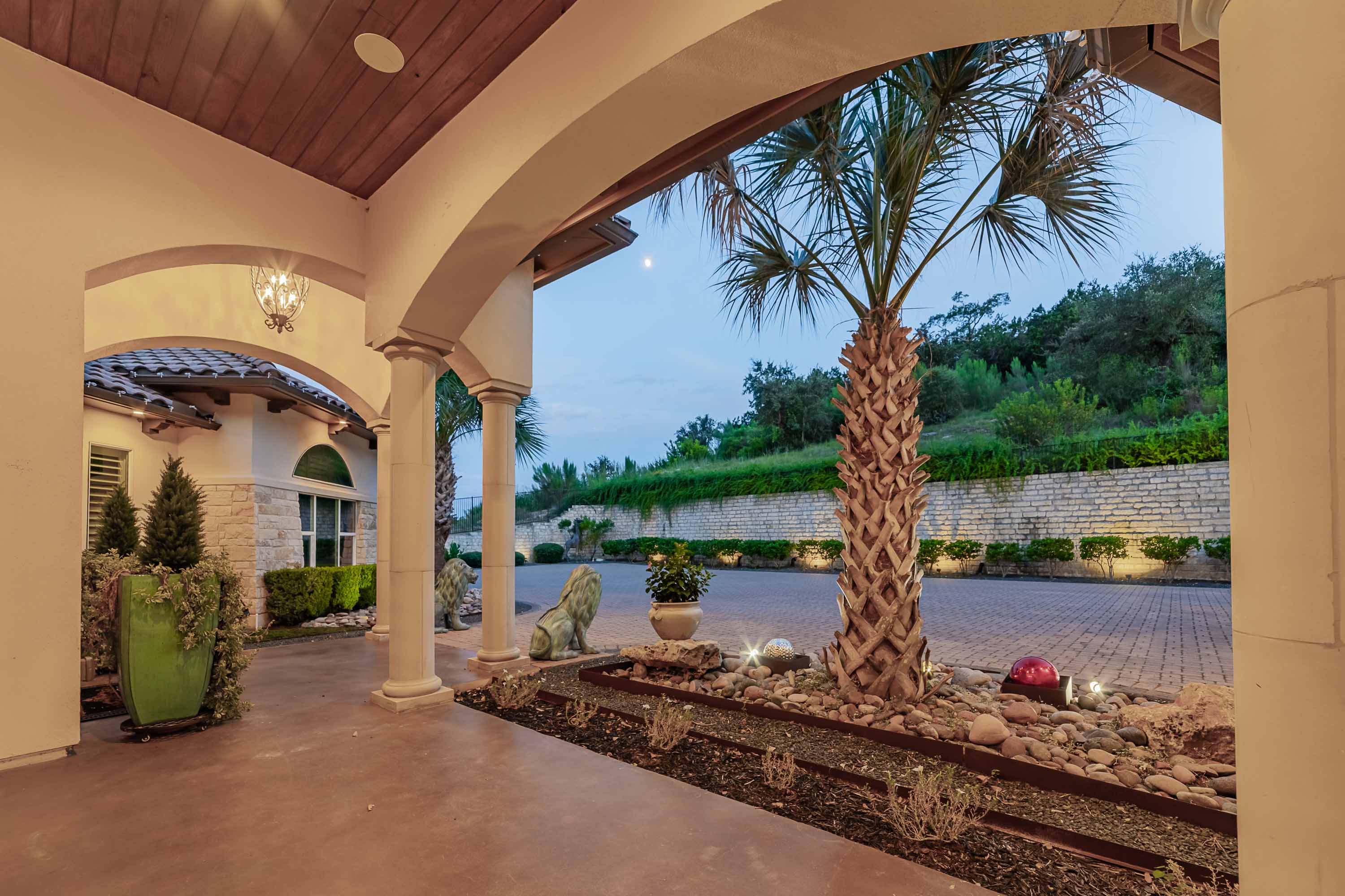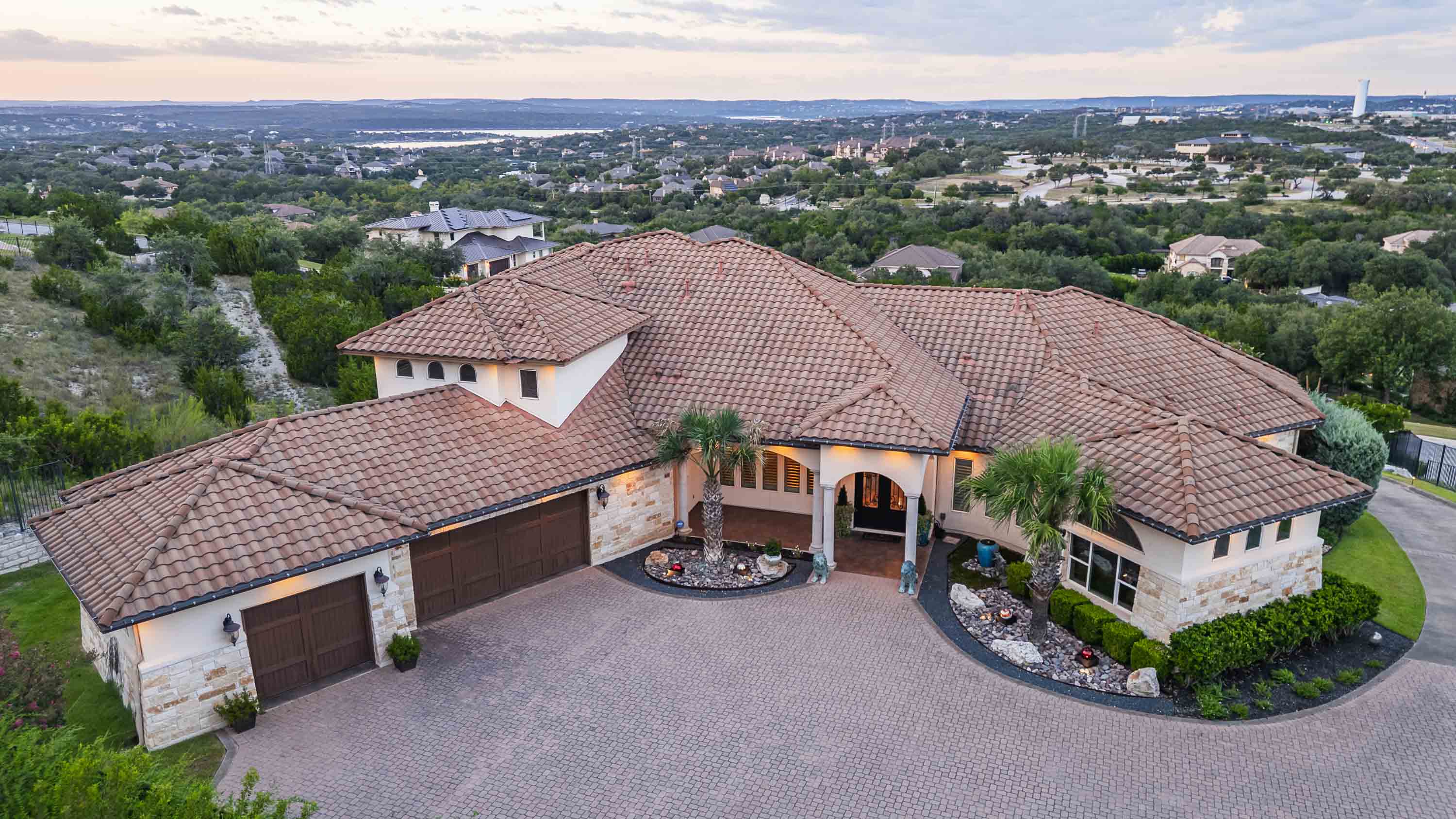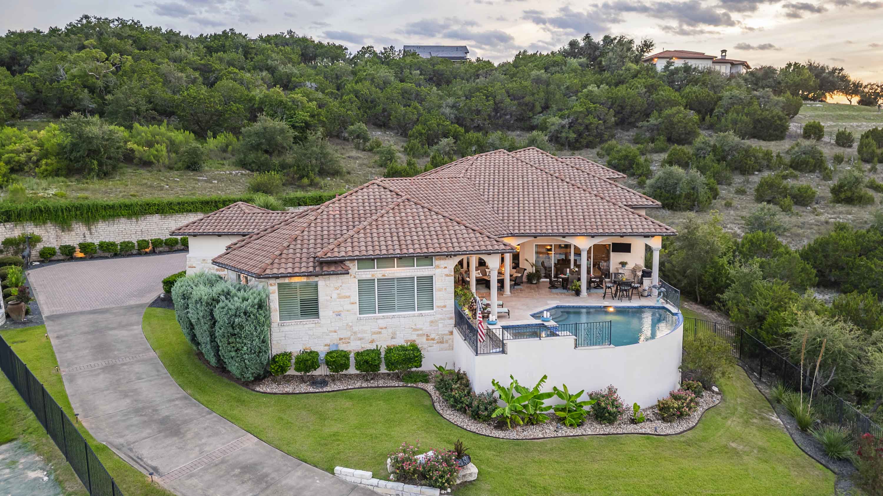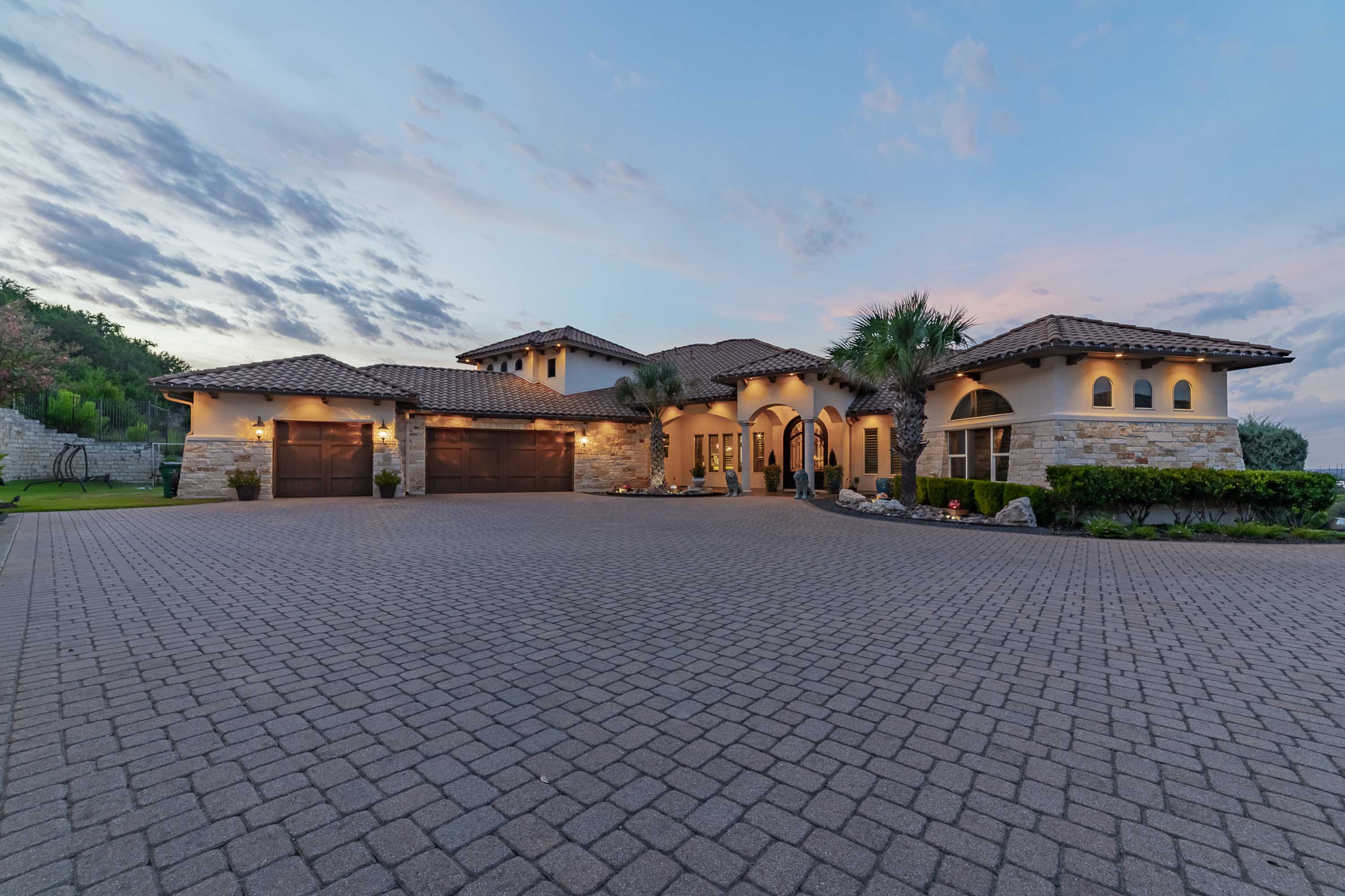 The crown jewel of Bella Montagna, where every arrival feels like a grand entrance. Perched on the premier hilltop with commanding presence and visibility, this estate makes a statement from the moment you arrive. A gated drive leads to an expansive motor court with parking for 15+ vehicles, setting the stage for grand-scale living and entertaining. Texas limestone, tile roof, and double Cantera iron doors open to a hand-painted barrel ceiling entry framing sweeping Lake Travis and Hill Country views. Inside, soaring ceilings and custom artistry abound—wood beams, floating and hand-painted ceilings, and layered details throughout.