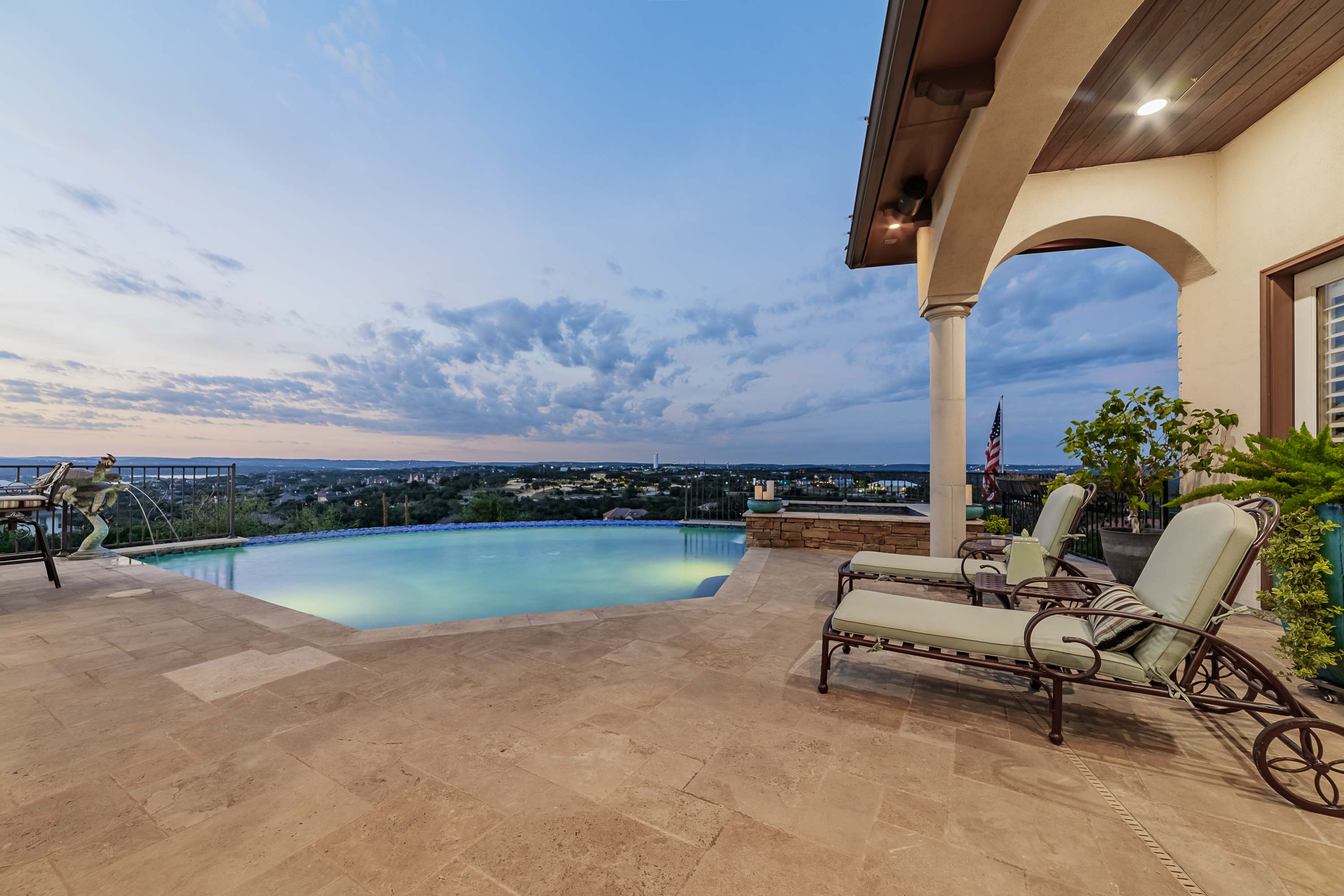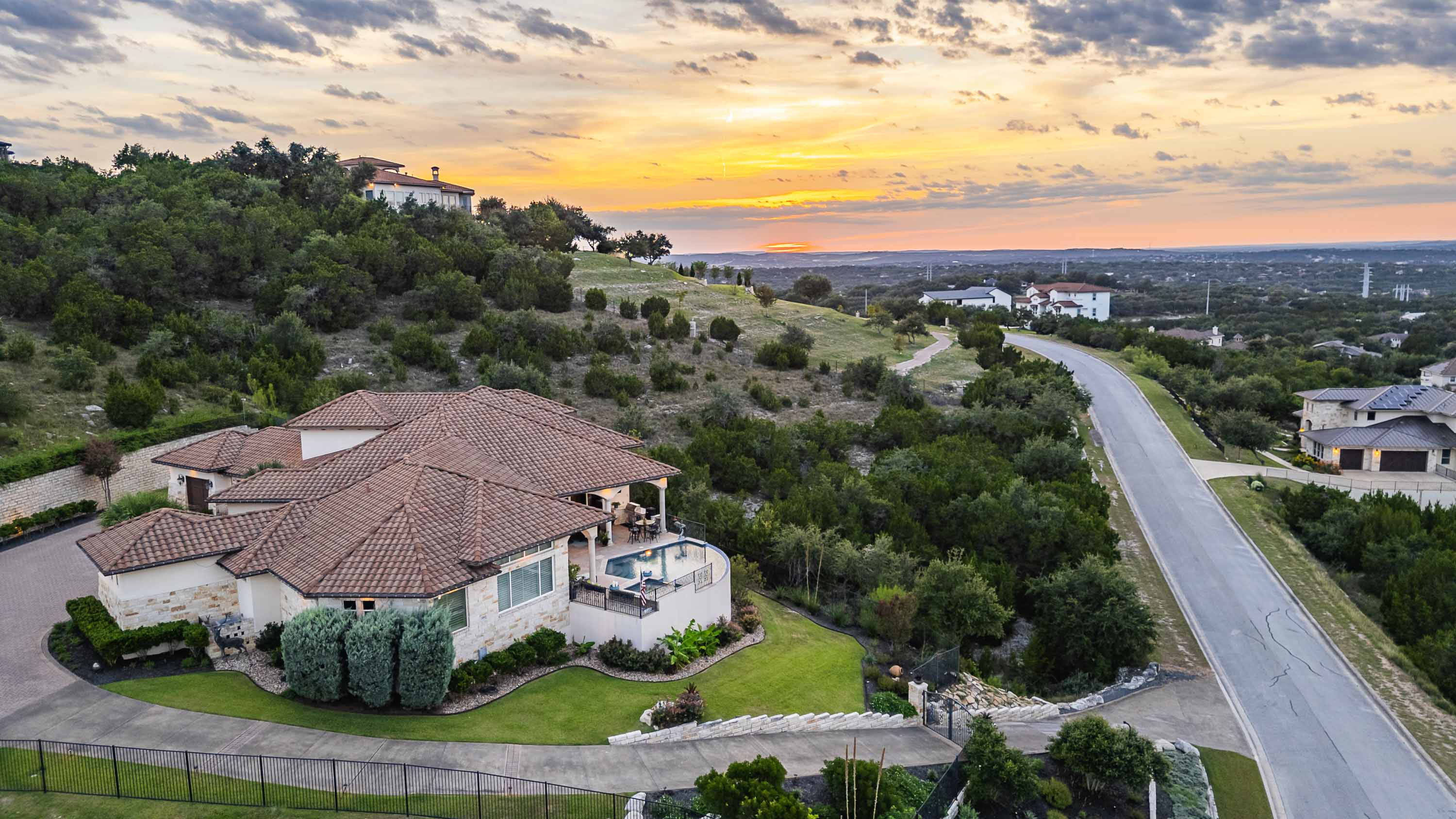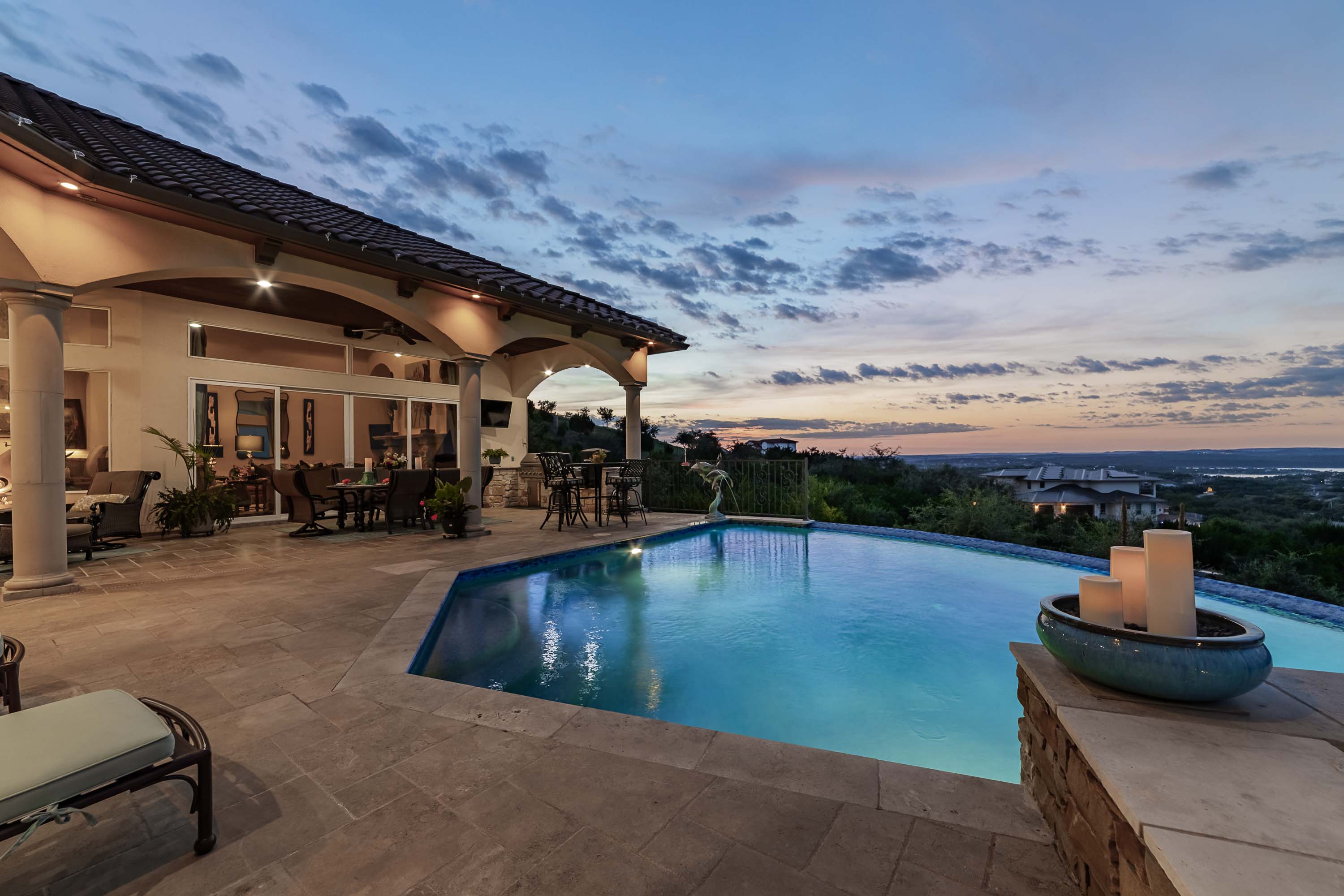 The owner’s retreat opens to 1,000 sf of covered outdoor living with summer kitchen, hot tub, and resort-style pool—perfectly oriented for year-round breezes. The suite also features an exercise alcove with views, a custom stone bathtub, and a triple-sized custom closet. Additional highlights include 3 oversized garage bays with storage and attic, granite windowsills, custom carved stone fireplace, plantation shutters, meticulous landscaping across 1.3 acres, and a low tax rate and HOA. Every room enjoys a view, every detail elevates the experience—an extraordinary chance to own the most visible and celebrated hilltop estate in Lakeway’s prestigious Bella Montagna.