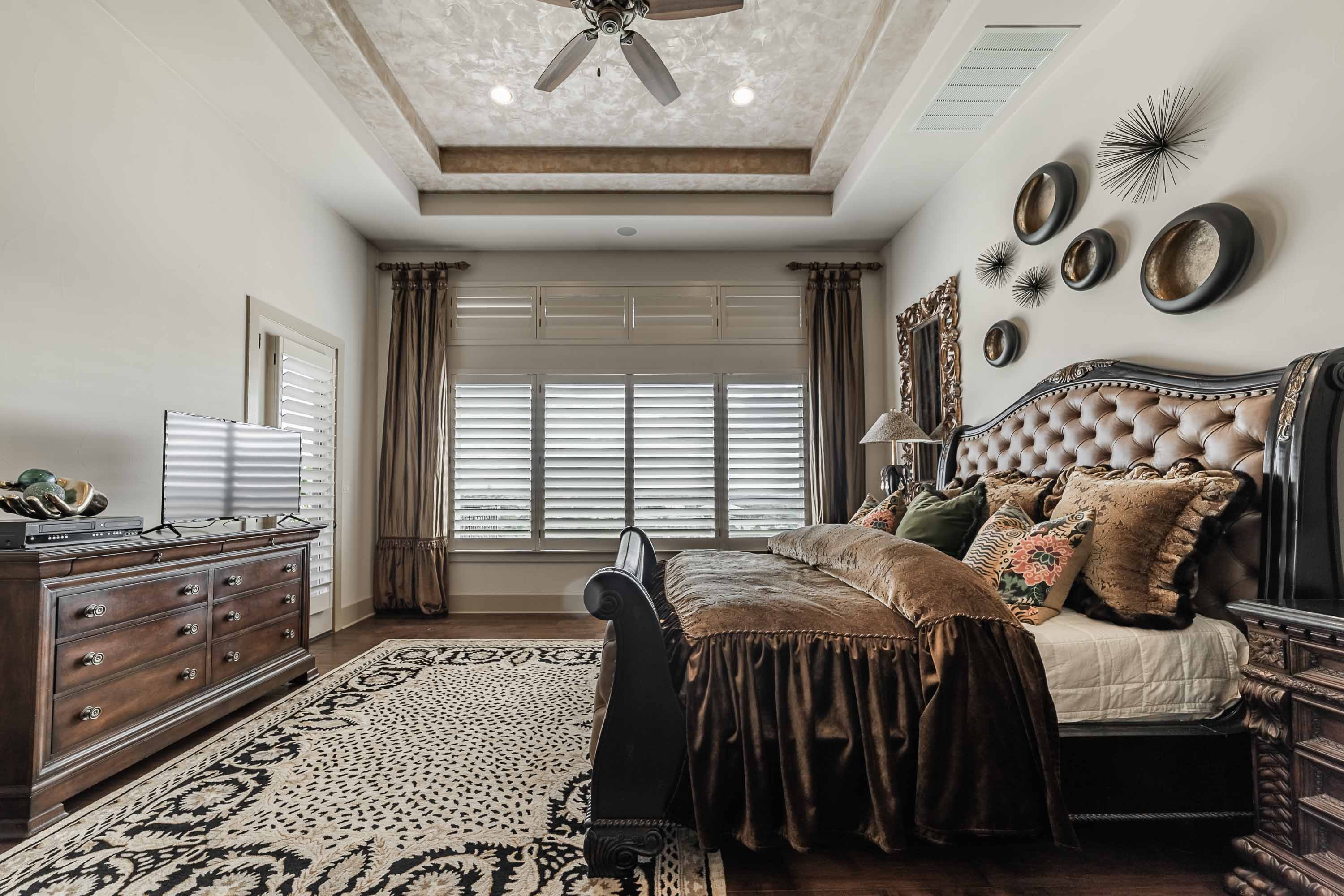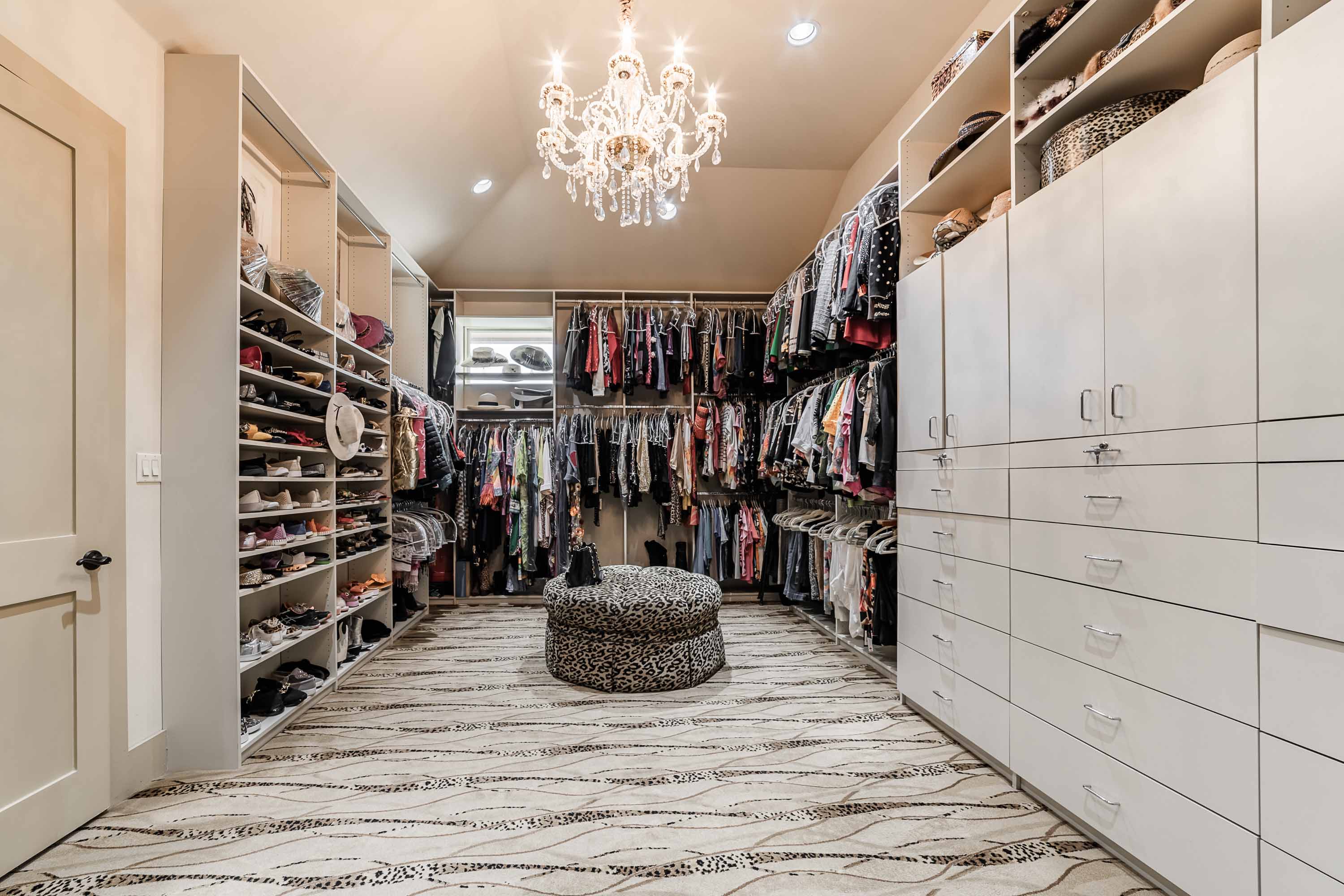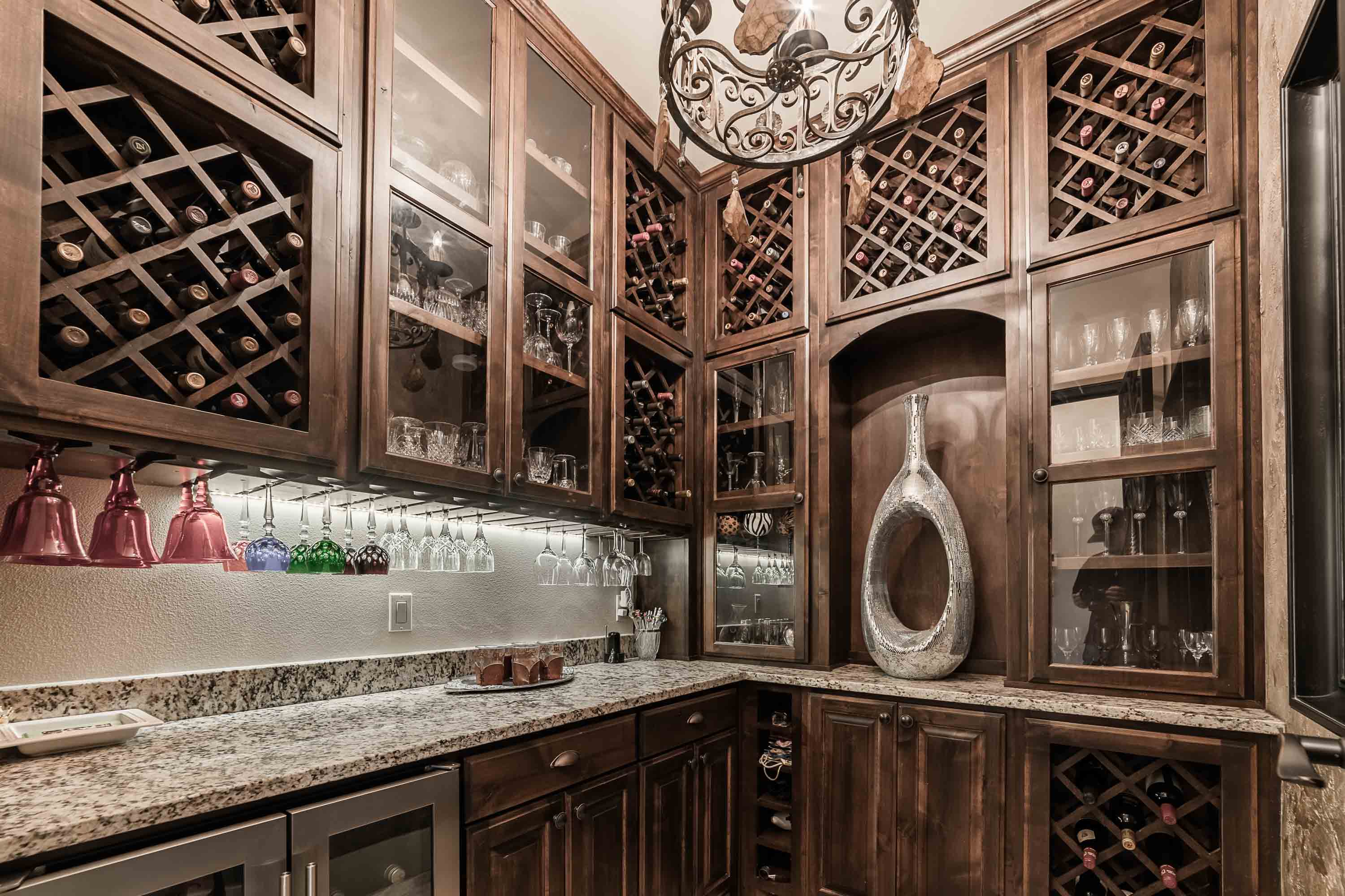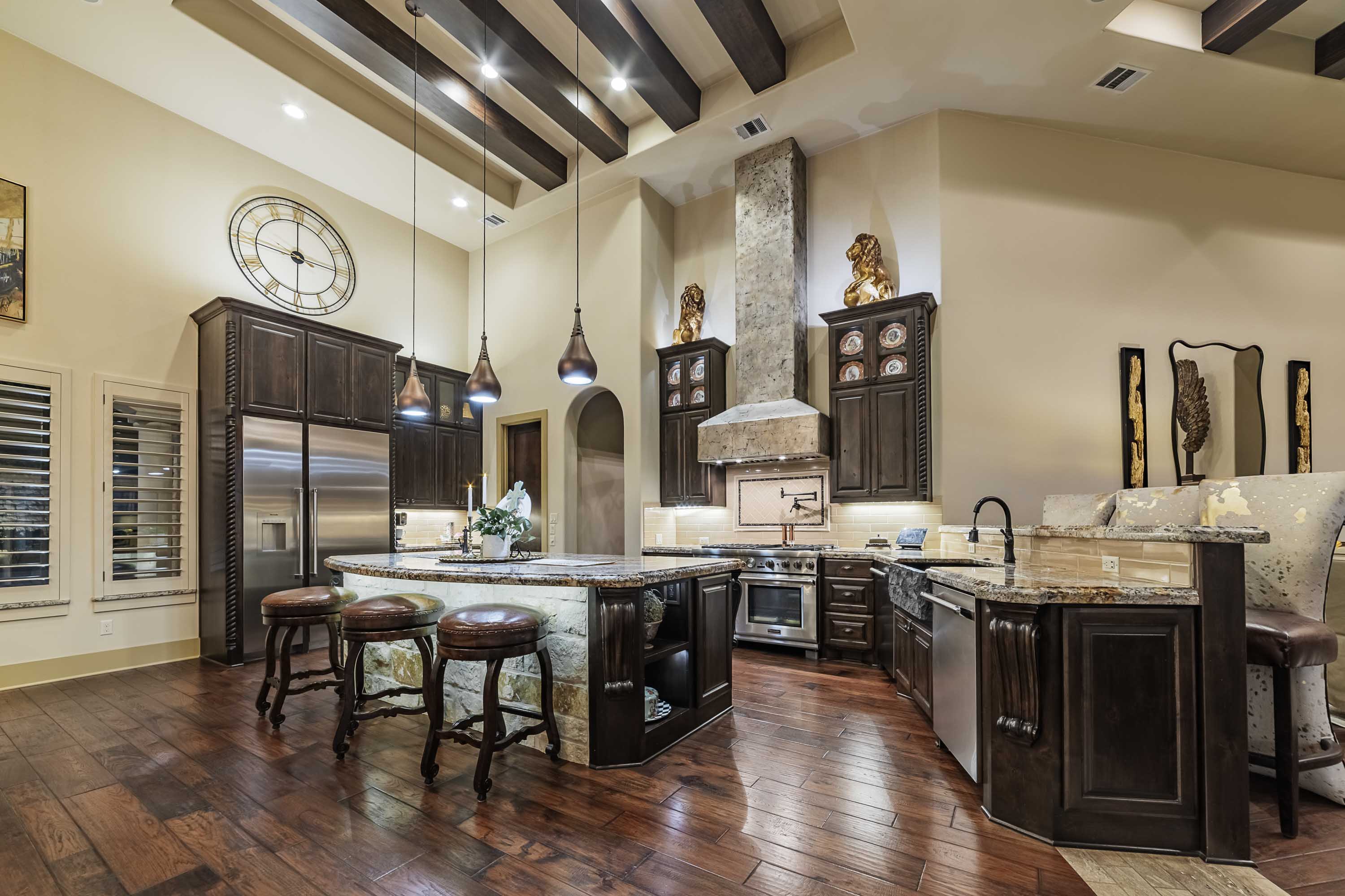 Designed to live like a single story, all four bedrooms offer en-suite baths and walk-in closets, with an upstairs wing providing two additional bedrooms, a living area, and its own HVAC zone. The open kitchen, dining, and family areas center around a massive double-ogee granite island, with chef’s amenities including double dishwashers, pot filler, six-burner cooktop with griddle, convection/steam ovens, warming drawer, built-in refrigerator, walk-in pantry, copper prep sink, and extensive cabinetry. A Cantera-door wine room with refrigerator and bar completes the space.